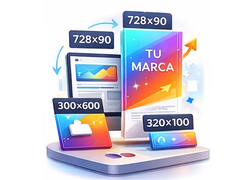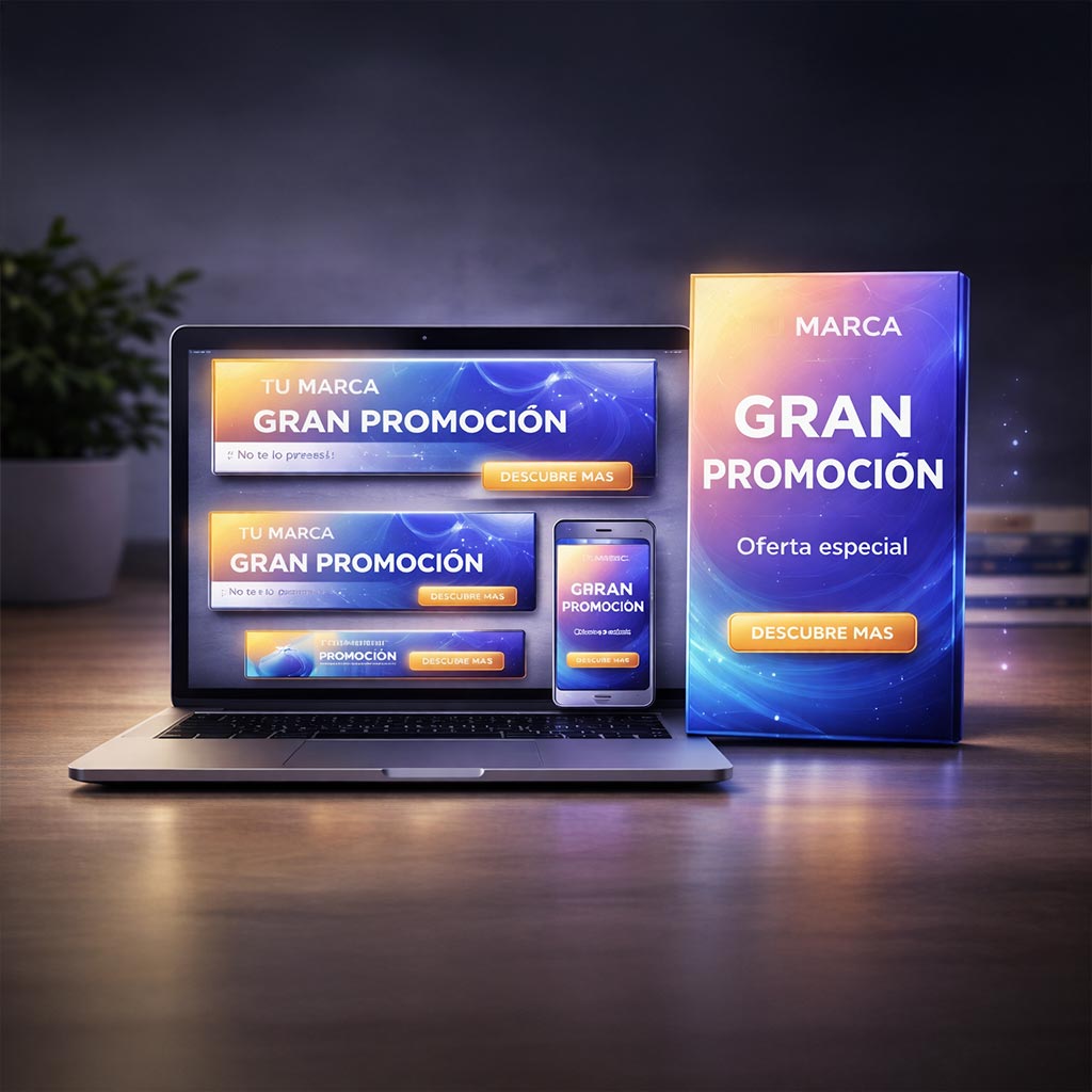 Banners HTML Los banners digitales bien diseñados captan la atención, mejoran el rendimiento de tus campañas y aumentan los clics. ¿Qué es un banner HTML y por qué tu negocio debería usarlo? Un banner HTML es una pieza publicitaria digital diseñada para aparecer en páginas web, apps y plataformas de publicidad online. A diferencia de una imagen estática, un banner HTML puede incluir animación, interacción y mensajes dinámicos que captan la atención del usuario. Un buen banner está diseñado para: captar la atención en segundos comunicar un mensaje claro reforzar la imagen de marca dirigir al usuario a una acción (clic) Las empresas que utilizan banners bien diseñados mejoran el rendimiento de sus campañas y aumentan sus conversiones. ¿Qué incluye nuestro servicio de banners HTML? Diseño visualprofesional Creamos banners con un diseño moderno, claro y alineado con tu marca. Adaptacióna formatos Diseñamos piezas en distintos tamaños para campañas completas. Optimizaciónpara campañas Banners ligeros y preparados para plataformas publicitarias. AnimaciónHTML5 Añadimos movimiento para captar más atención y mejorar el rendimiento. Así puede verse tu campaña de banners Un diseño coherente en todos los formatos ayuda a reforzar la campaña y mejorar la visibilidad. Este servicio es ideal para Como trabajamos Recibimos la información Nos envías textos, imágenes y detalles de la campaña. Diseñamos los banners Creamos las piezas visuales optimizadas para publicidad. Entrega final Recibes los banners listos para subir a tu campaña. ¿Necesitas banners para tu campaña? Creamos banners listos para publicar, optimizados para captar atención y mejorar resultados. Solicitar presupuesto